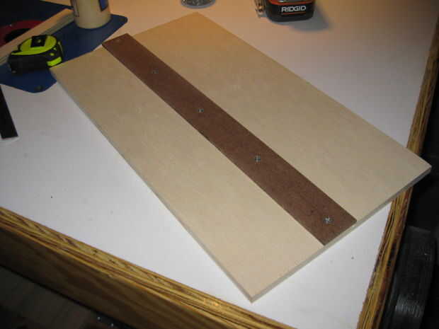 Palmada en el pegamento, alinee su carril con el corte superficial y lanzar un tornillo en un extremo. Ahora marque en el otro extremo y asegúrese de que utilizar un cuadrado para la verificación. Conducir algunos tornillos más. Utilicé tornillos para madera # 6 1/2" y se taladraron previamente la madera prensada con buriles. Cortado la tabla exceso en este momento.