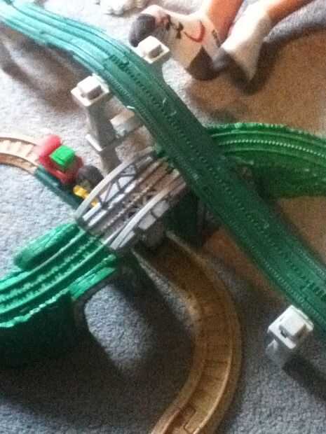 Nuestro sistema de pista de tren de madera (una mezcla de Brio y Lillebo de un chop de caridad) carecía de ensambladuras y acaba de tener un puente jorobado, por lo que hemos añadido un conjunto barato de Morrisons a nuestra colección.Esto vino con u