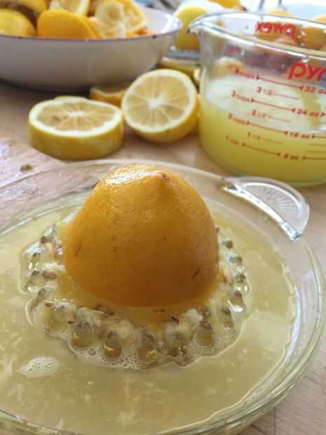 Exprimir los limones. Fuertemente recomiendo usar uno de cristal bol-style exprimidores de limón, pero los dispositivos de estilo de mano Vice grip trabajan, demasiado. No son tan bueno o eficiente. Si usted tiene un exprimidor, enloquecer, pero probablemente tendrás que pelar los limones primero. Al final de este proceso, tuve 4 tazas de jugo de limón increíblemente delicioso. Eso es bastante.