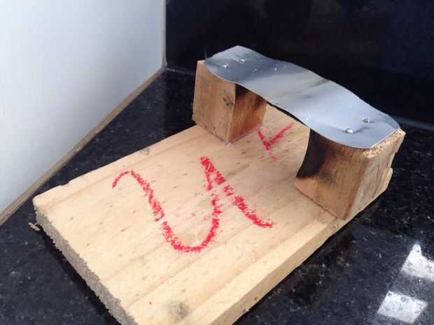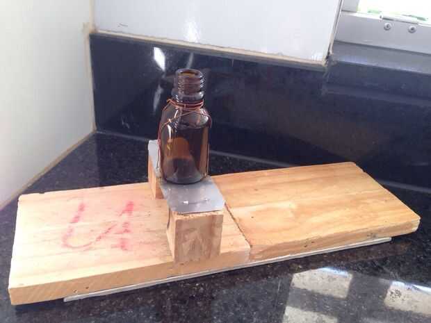 1 - Junte como placas de madeira para o tamanho caiba o resto da estrutura, prenda os blocos de madeira e una placa de aluminio com os pregos para dar suporte ao recipiente de vidro (como mostra na imagem).