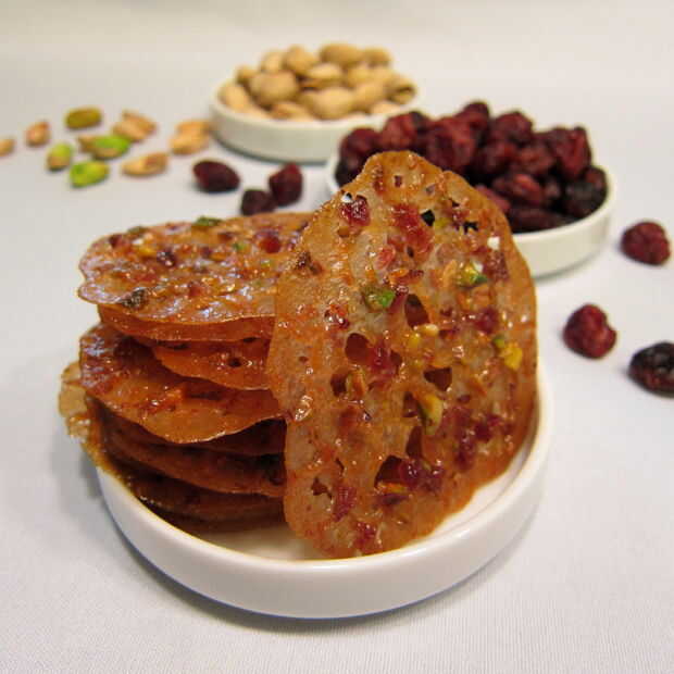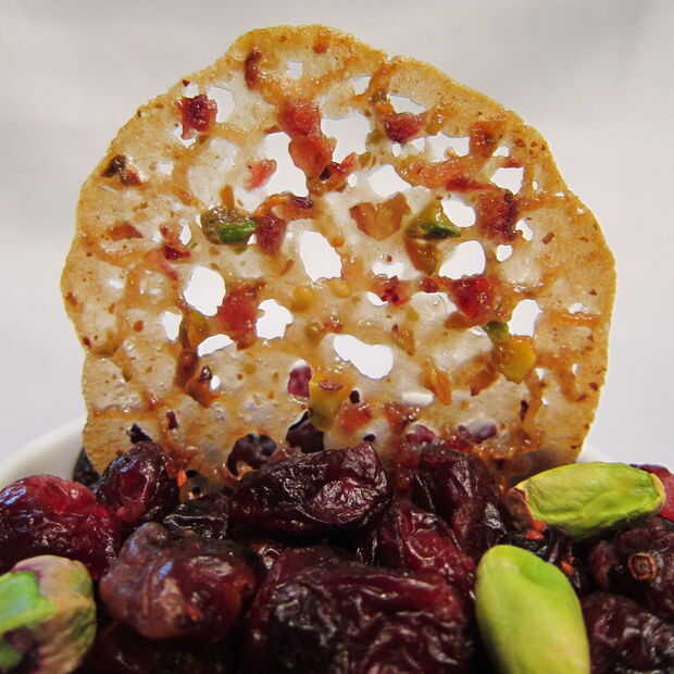 En una cacerola pequeña derretir la mantequilla, azúcar morena y el néctar de agave. Retirar del fuego y agregue harina hasta combinar, arándanos y pistachos.