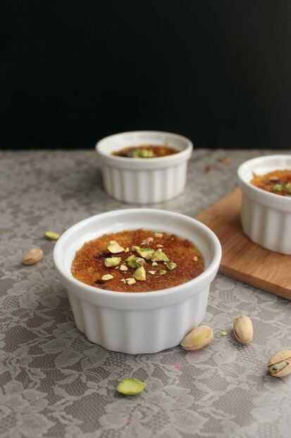 Creme brulee es delicioso por sí mismo, pero añadiendo los complejos sabores de pistacho y agua de rosas se llevará hasta un conjunto nuevo nivel gourmet. Esta receta utiliza una mezcla de crema quemada, por lo que no ser intimidado - es sorprendentemente fácil! (Y nunca te diran nadie que no lo hagas desde cero!) Usted ni siquiera necesita una antorcha a la hermosa bruleed azúcar en la parte superior!