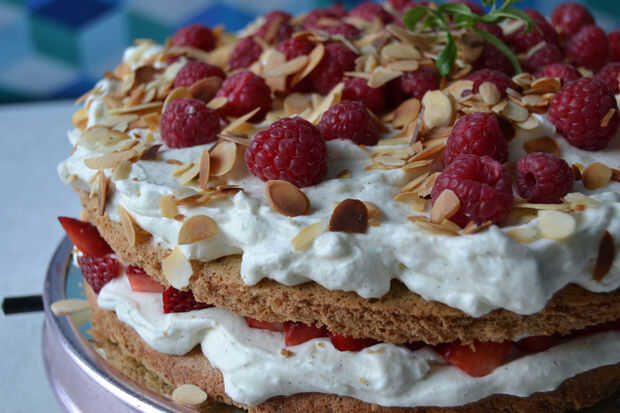 2 capas de galleta de pistacho esponjoso cubierto con una luz de cal y crema de vainilla y trozos de fresas frescas y algunas frambuesas. fue tan buena que tenía dos piezas yo mismo.