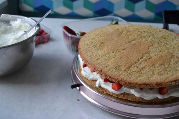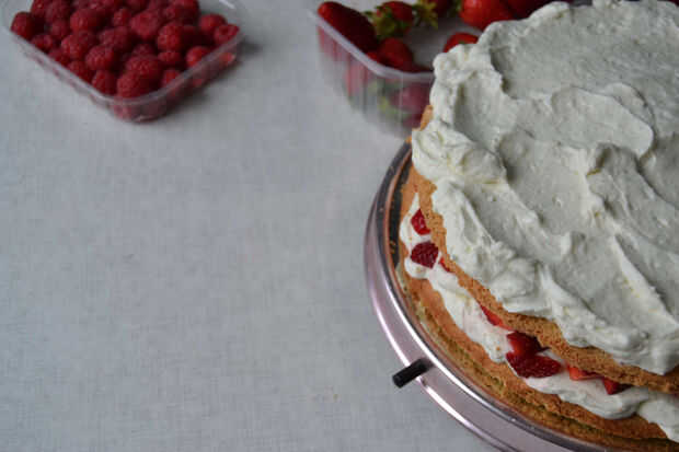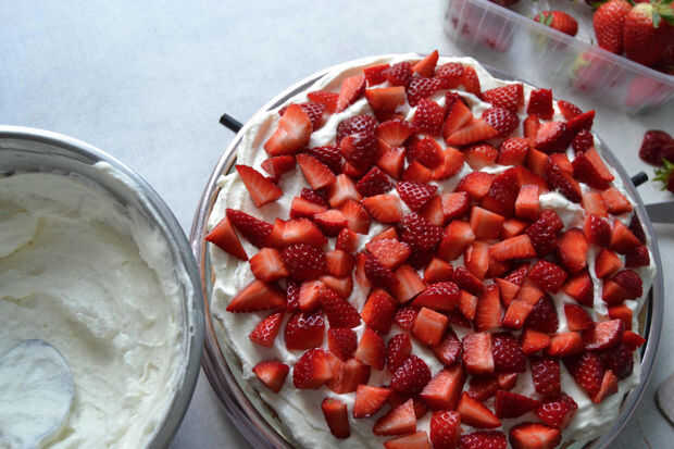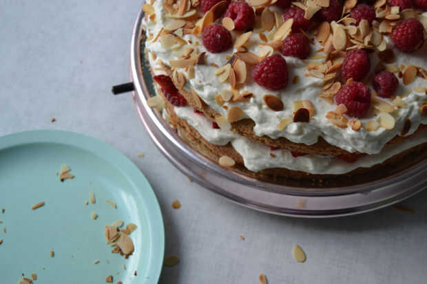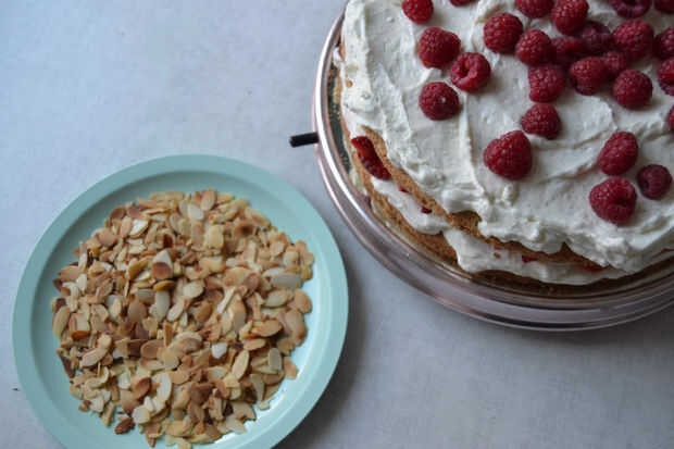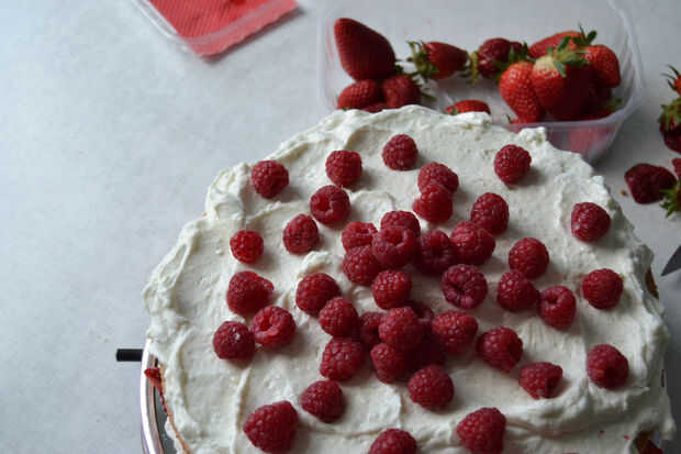 Coloque la segunda galleta en la parte superior, presione ligeramente hacia abajo de modo que quede asentada firmemente sobre la capa de crema y fresas. extender el resto de la crema sobre la galleta y cubra con las frambuesas.
