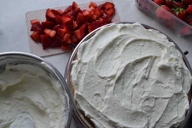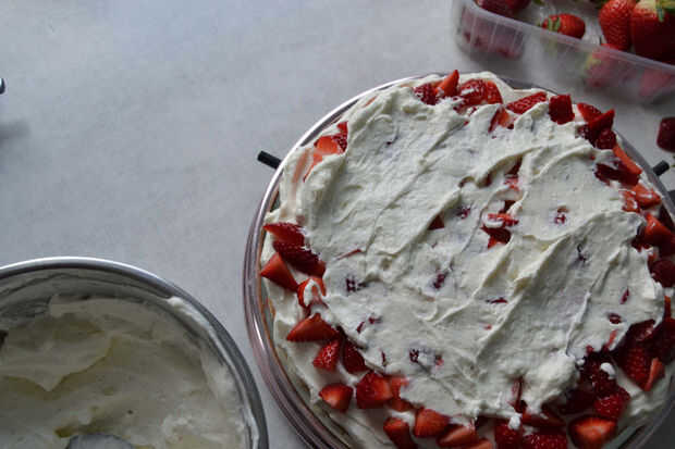 se diseminan un poco más de 1/3 de la crema sobre la galleta, poner encima los trozos de fresa y crema un poco más encima de las fresas.