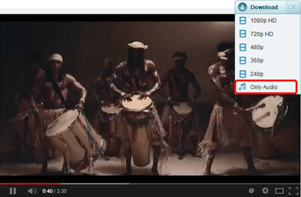 Realmente hay 2 formas de descargar directamente las pistas de audio de YouTube. Cuando usted está viendo vídeos de YouTube, hay un botón desplegable en la parte superior derecha del video, por favor simplemente haga clic en la lista desplegable y elija "Sólo Audio", luego la herramienta ayudaría a comenzar a descargar solo las pistas de audio inmediatamente.