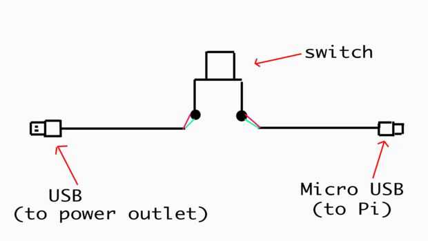 Luego tomar los dos cables USB micro y tira cada uno en el lado necesario para hacer una conexión desde el ladrillo de la energía USB a la Pi para conectarse. Hilo por los agujeros y soldar dos cables a cada lado del interruptor PS1 desde debajo de la. Uso un voltammeter para probar que la soldadura de puntos están conectados por el interruptor. Si usted soldar derecha, cuando el usb está enchufado en la pared, la Pi solamente debe recibir poder cuando se empuja el interruptor PS1.