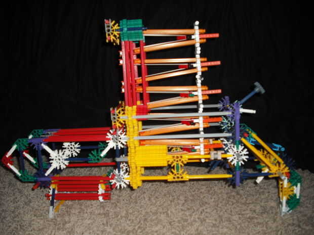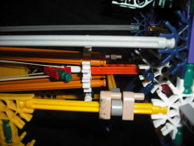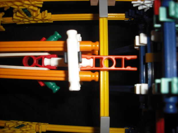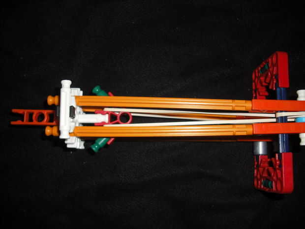 Cargue los cartuchos como en la foto. La bala a través de la banda de goma del gancho, tire de él hacia atrás a través del orificio en el extremo blanco y la pieza naranja a éste. Cuando haya cargado, cae en los rieles en la parte superior y deje que se deslice hasta la barra de tiro. Cuando el gatillo, la pieza naranja se rompa, lanzando la bala y dejando el cartucho vacio sin caerse de la parte inferior de la pistola.
