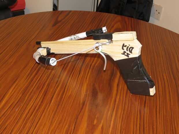 aquí está mi pistola ballesta, puede disparar hasta 15-20 pies, y es bastante fuerte. Espero que les guste! Lo siento pls, utiliza un poco su diseño del gatillo de su ballesta, podría no pensar en cualquier otro disparador. Como dije, me separe creac