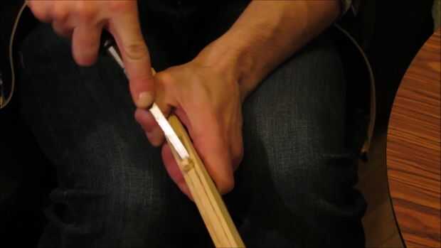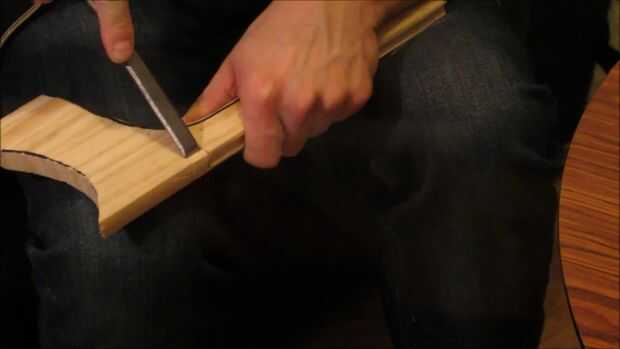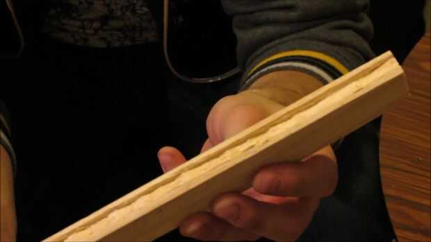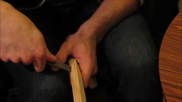 Utilizando un cincel cuidadosamente tallar una diapositiva para una flecha como se muestra. Y un lugar para coger la cuerda de un arco como se muestra.