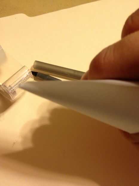 Tomar una tira de papel y rodillo en un cono. El cono debe llegar a un punto agudo y ser tan largo y fino como sea posible. Una vez creado el cono, utilizar un pequeño pedazo de cinta adhesiva para sujetar desde la punta del cono.