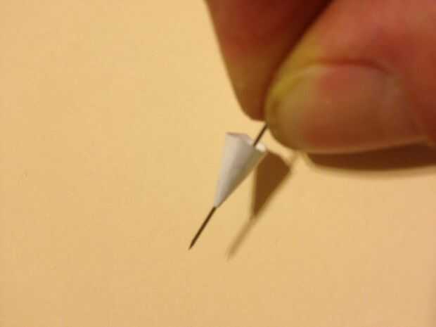 Una vez que el cono está ajustado correctamente, añadir un alfiler por la punta de proyectil. El pin debe tener una bola o cabeza en un extremo (no una aguja de coser). Empujar el punto de perno en el cono de la parte posterior para que apunte a la parte frontal del cono.