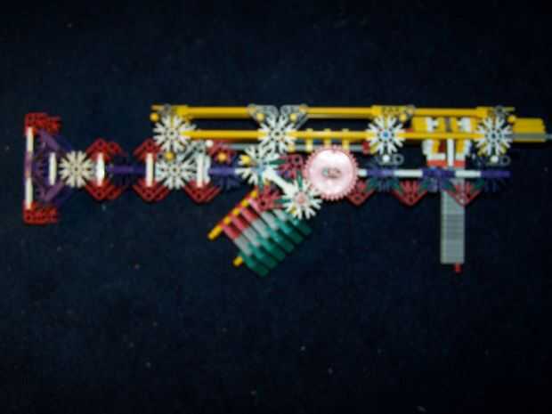 este arma es una pistola de 8 banda de goma tiro semiautomático con un giro, su hecho totalmente de K'NEX!!!!!! Cuando lo piensas bien es un muy simple mechinism, me topé con él mientras estaba tratando de disminuir el índice del fuego de un arma tot