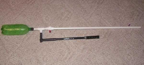 Asamblea es bastante simple y sencilla-la bomba que tengo se ajusta perfectamente dentro de la tubería de pvc de 1/2 pulgada. como se puede ver primero de todo lo que debe pvc cemento juntos los 3 tubos de pvc al una lado T al botella de 2 litros un lado hasta la bomba y a un lado con una pequeña sección de pvc va a la válvula de bola. cualquiera de estas secciones puede hacer cualquier longitud te gusta, pero más el barril (hasta aproximadamente 3 1/2 pies de largo) el mejor. PVC cemento la bomba, botella de 2 litros y válvula de bola para sus tubos apropiados. pero no pvc cemento el cañón para el calibre de la bola porque es más fácil sacar el cañón para poner la munición en.