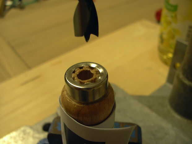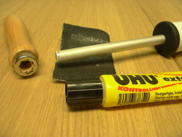 Taladre un agujero de 8 mm en el mango de madera. Pegar a la barra.