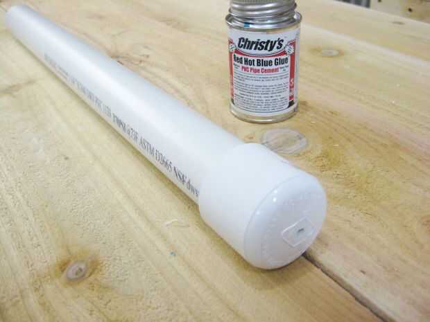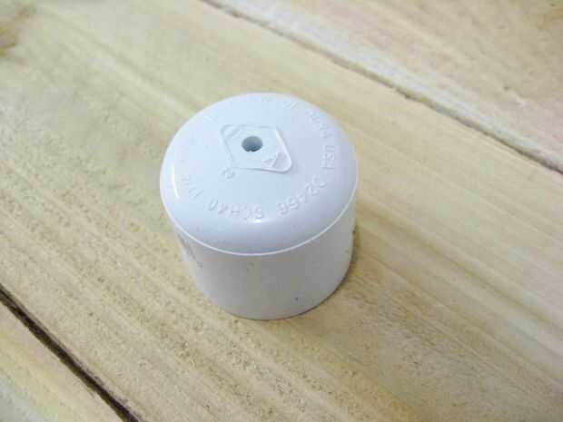 Perfore un orificio de 3/16" en el centro de la tapa de 1 1/4" y en PVC para pegar esto a un extremo de la tubería de 1 1/4". Siga las instrucciones en la botella de cemento.
