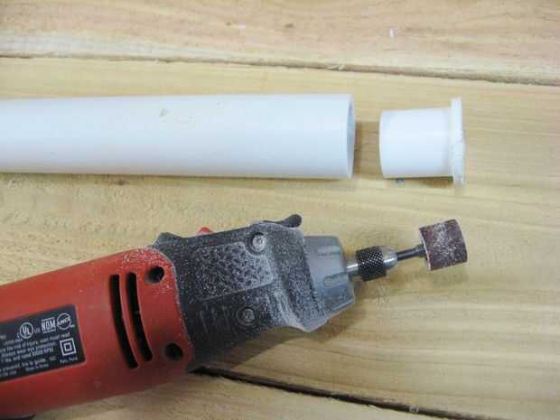 Para que sea ajuste, solía un tambor de lijar en mi herramienta rotatoria arena hacia abajo una pulgada o tan del interior de la tubería de 1", hasta que el enchufe se puede inserta y extrae sin demasiados problemas.