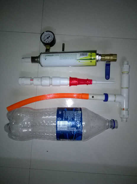 - Si no ha hecho todavía, entonces coloque el tanque de aire, agua de togetherAttached de sección y boquilla T llena botella a la pistola