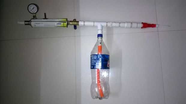 Se trata de una pistola de agua de tubos de PVC y algunas guarniciones de cobre amarillo.