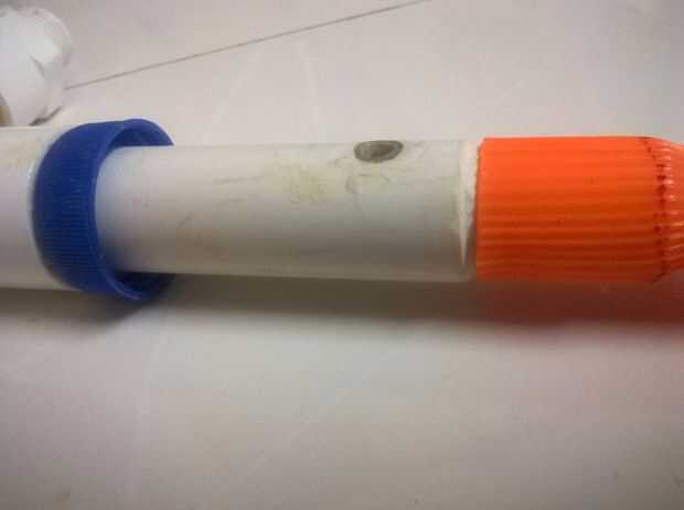 Esto dará inicio a su próxima pelea pistola hasta un 11 sobre 10Paso 1:Cortar un trozo de tubo de pvc grueso de 1 1/2 pulgadas 16 pulgadas de largo. Esta voluntad sere como el eje de su martilloPaso 2:Para la cabeza del martillo usé un azulejo de sue