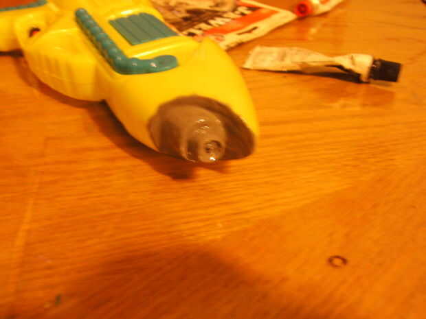 En primer lugar, mezclar un poco de JB Weld y cubierta de la boquilla de la pistola de agua (trata de no cubrir el agujero donde el agua se tira fuera de). Ayuda si pones una aguja ahí a medio camino en.