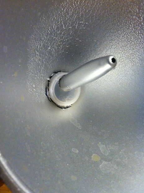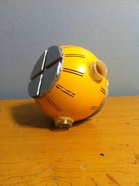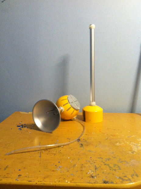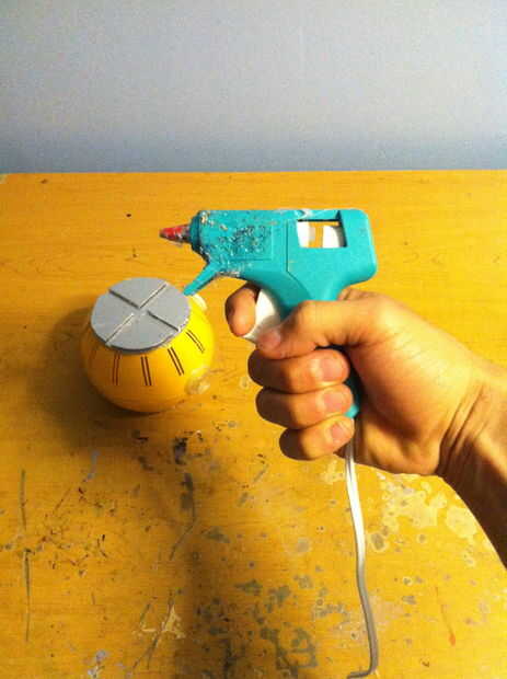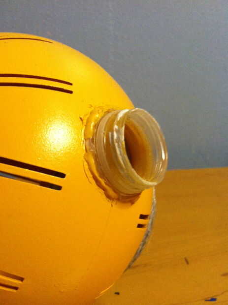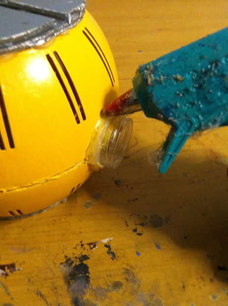 2 x tapones de botellas para sujetar el embudo a la bola. Bola del PVC. Pegamento caliente cada extremo a su respectiva parte. No caliente tapa de pegamento cerrar juntos.