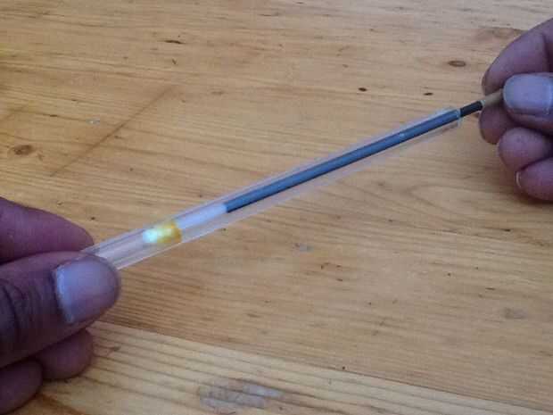 Con el cartucho de tinta empuje la piel hacia el extremo delgado del tubo.