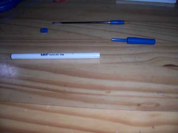 La primera cosa a hacer es desmontar la pluma. Asegúrese de que hay un tubo que es el mismo tamaño a través de todo el camino como en mi foto. Cuando tu toma lo poco tapón en el extremo puede generalmente sacarla con la maquinilla de afeitar o un clavo.