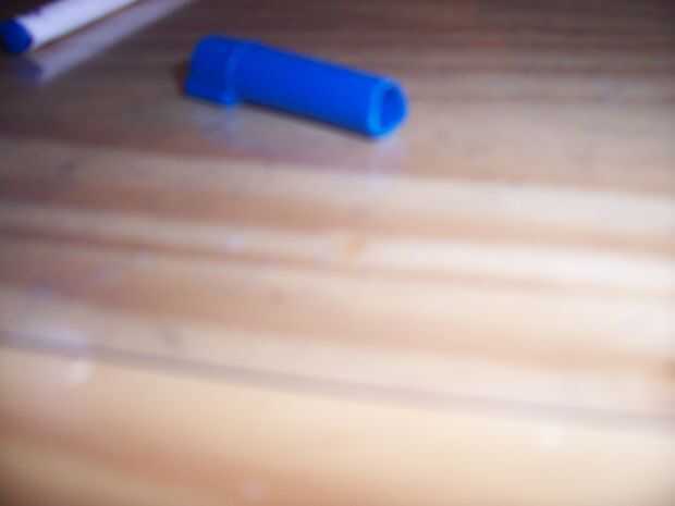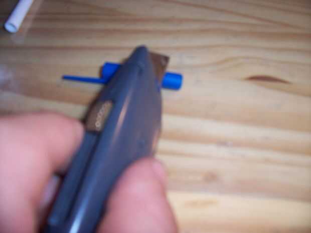 ahora necesitas algo para poner la revista a por lo que permanece en su lugar pero se puede sacar. Utilicé una tapa de pluma. Simplemente todo lo que hacemos es cortar el extremo de la tapa de la pluma para dejar el bb caen a través del agujero que usted acaba de hacer en el cañón. Entonces, así puede cinta adhesiva hacia abajo, corta dos líneas paralelas ambas cerca de 1/4 de la manera en la pluma. Cuando usted Extraiga las aletas detrás debe mirar como un plátano o una escopeta en una historieta cuando elmer fud pega los dedos al final y tira el disparador.