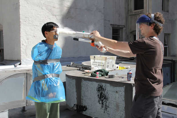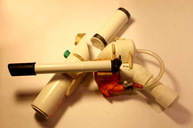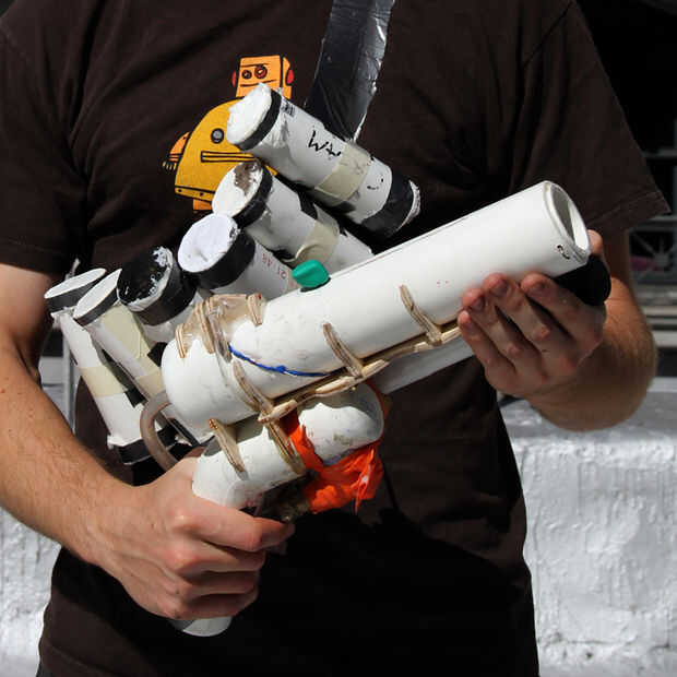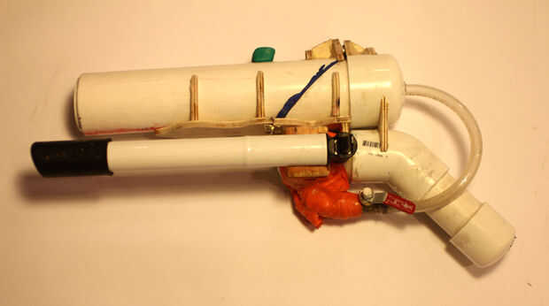 Hay algunas cosas que pueden ir mal cuando usted está construyendo y jugando con esta arma. Que va a utilizar cosas afiladas para cortar plástico. Usted jugará con taladros, sierras y pegamentos tóxicos. Voy a poner una cámara de presión casera bajo mucha tensión interna. Y sí, te tiro a tus amigos en la cara. Por favor sea sensato. Use gafas de seguridad y usar responsablemente su pistola de alquitrán y plumas.