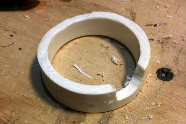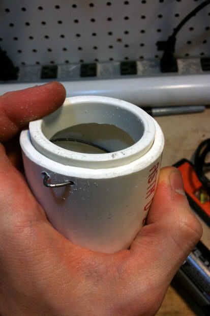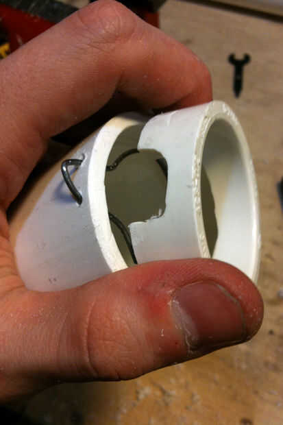 En este momento, me di cuenta que cuando presioné el émbolo en el cilindro, el resorte tiende a sobresalir el extremo abierto del barril y se enreden. Para conseguir alrededor de esto, redujo la abertura del cañón ligeramente por recorte de otro pedazo del conector recto de PVC de 1.25" y pegado en lugar.