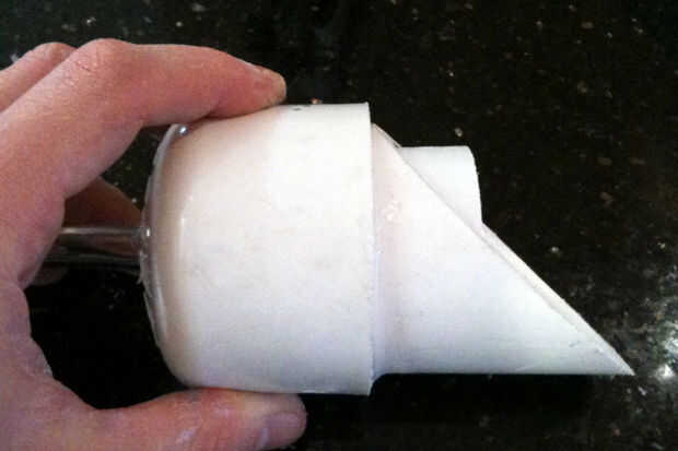 Hubo todavía una cavidad grande dentro de esta pieza, que era indeseable para el mantenimiento de una buena cabeza de presión. Lo solucioné esto rellenando la cavidad con masilla de plomería y meter un agujero a través del mismo modo que todavía puede flujo de aire, a través de un canal más estrecho.