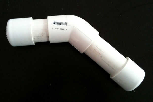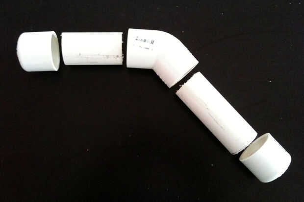 La forma básica de la empuñadura se hace de dos tramos de tubo de PVC de 1.25"(3 pulgadas y 4 pulgadas), unida por un conector de 45° y un tope en ambos extremos.