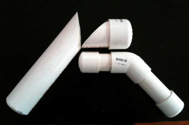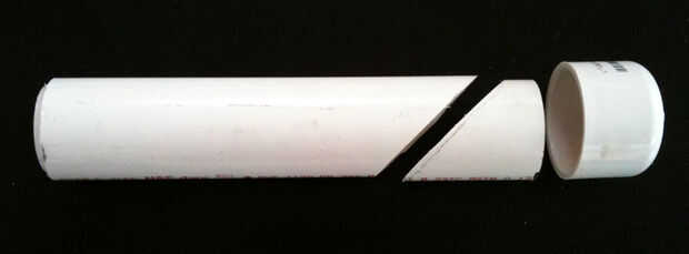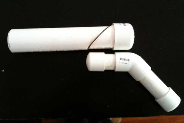 El barril fue hecho de una longitud de 11 pulgadas de tubo de PVC de 2", cortado en un ángulo de 45° aproximadamente 1,5 pulgadas de un extremo. Puedes ver aquí cómo fue diseñado para caber encima de la cámara de presión, luego abra hacia abajo para permitir que el usuario inserte y retire los cartuchos.