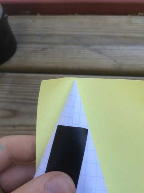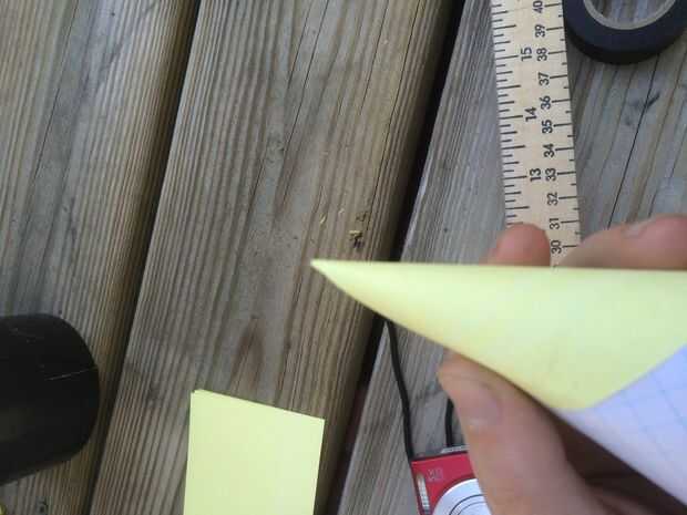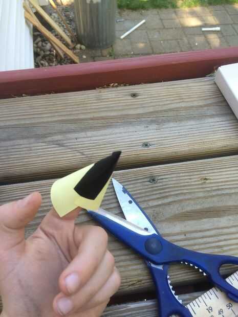 Después de tener el cono de nota adhesiva pequeña hecho, necesitamos que sea del tamaño correcto y corte. Para ello se necesita poner el cono uno de sus dedos, y empújelo firmemente en un pedazo de desecho de PVC (o un extremo del cañón), pero no tan duro que las ruinas del cono y darle un leve. Tire de él hacia fuera, y usted debería ver un pliegue curvo. Use sus tijeras y corte la línea.