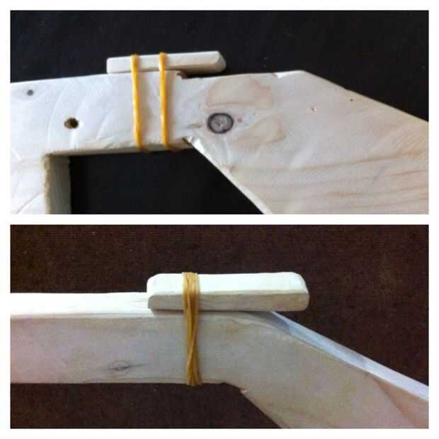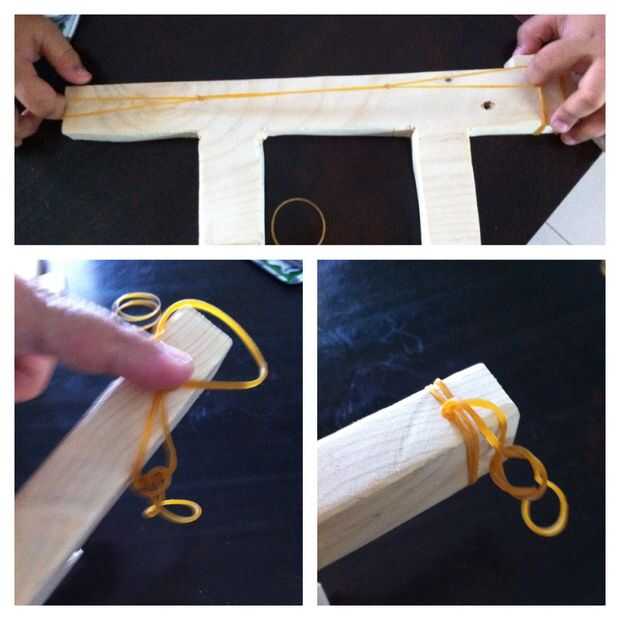 En la boquilla, varía la goma para obtener la correcta fuerza de la eslinga de la boquilla para el gatillo. Combinar 2 o más goma hasta llegar la fuerza derecha. Atar la goma como en foto.