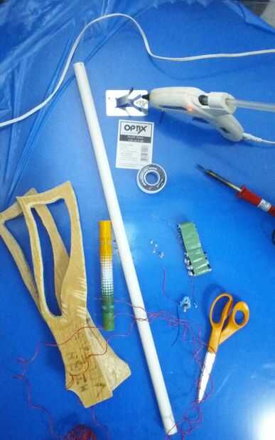 Primero se recogen los materiales caja tubo, pistola de pegamento caliente, 2 15 pulgadas por 6 pulgadas piezas de madera de roble, resina base soldadura, soldador, cinta adhesiva, un montón de alambre, 7 condensadores, un botón, un risistor, un LED, un conector de batería de 9 voltios, tijeras o cortador de alambre, y un bosque de la Sierra