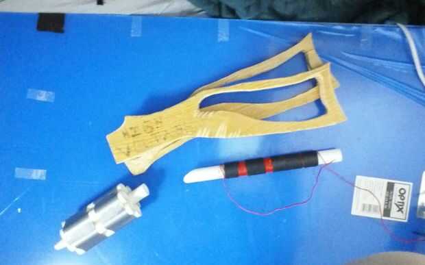 Hacer lo siguiente: un tubo con el alambre envuelto alrededor de él, 6 piezas de tubo envuelto alrededor de otra pipa y su stock de madera con un chized gran parte hacia fuera de
