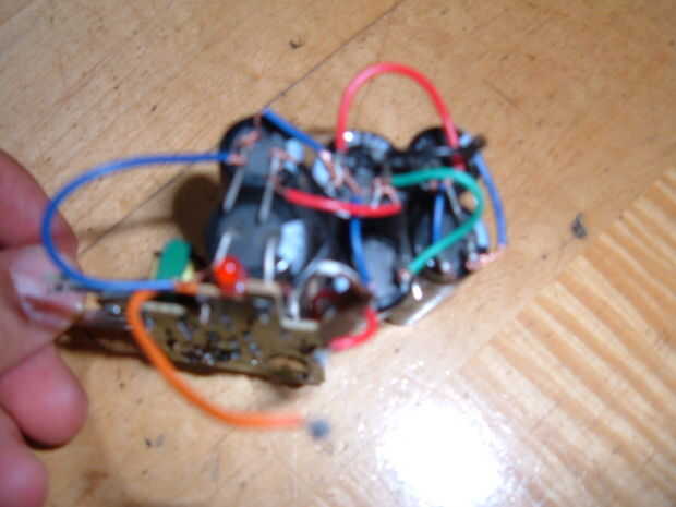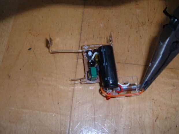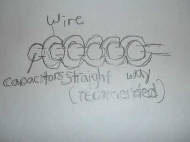 Cortar primero el flash en el circuito de carga (se muestra en la siguiente imagen). Ahora desea conectar las patas izquierdas en los condensadores y siguiente todas las patas derechas. Una vez que se hace con cinta adhesiva todos juntos y agregar otro dos cables en el extremo del condensador sexto. apilan mina, pero debe hacer una recta, así es más fácil conectar todas las patas izquierdas y todas las patas derechas.