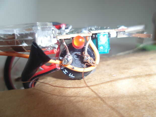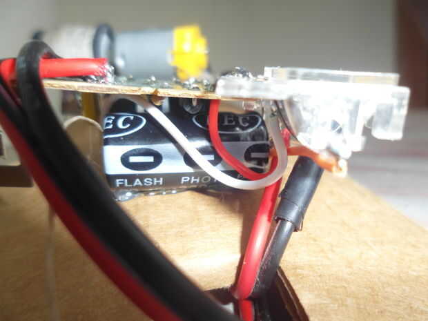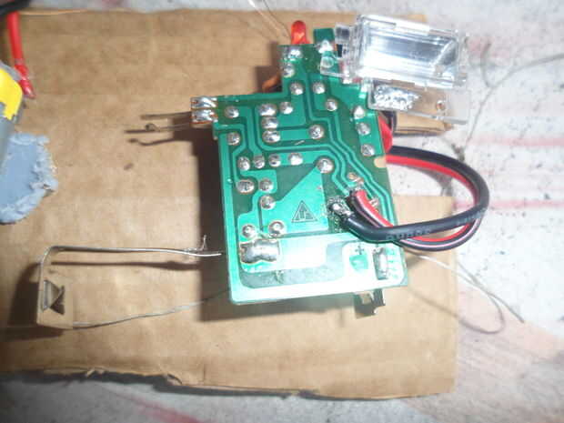 Ahora tenemos que hacer algunas ligeras modificaciones en el circuito de flash. ADVERTENCIA cámara desechable flashes circuitos tienen condensadores de alto voltaje y no soy responsable si te duele a ti mismo o para otra persona durante el proceso de fabricación o utilización de este producto. Lo primero que tienes que hacer es quitar la batería. Lo siguiente que necesita es cortocircuitar el condensador para hacer que tome un destornillador con mango plástico o de goma y toque a los cables del condensador al mismo tiempo. Al hacerlo puede haber una gran chispa que significa que el condensador está en cortocircuito hacia fuera y tiene poco a ningún cargo. Si no hay ninguna chispa que significa que el condensador no tenía cargo para comenzar con. El circuito ahora es seguro al tacto. Ahora lo que tienes que hacer es reemplazar el interruptor momentáneo porque el interruptor es un pequeño trozo de metal que es un panel para usar y no es muy accesible. Me decidí a hacerla accesible a mi mano derecha, así que voy a utilizar algún cable para extender el cambio a mi mano. Así que tomar el circuito de flash y buscar el botón pequeño de metal. Una vez que encuentre la tapa del botón del circuito sobre debería ver tres pequeños dientes procedentes de la curva de botón derecho. Cuando eso se hace el botón debe venir de la derecha. Bajo el botón que debería ver tres pequeños puntos que se tocaron los tres dientes y uno grande en el medio que necesita soldar un alambre cerca de un pie largo para el punto grande y otra para uno de los lugares pequeños. Cubrir todo el circuito con cinta aislante para que no choque a ti mismo. Ahora establece a un lado.