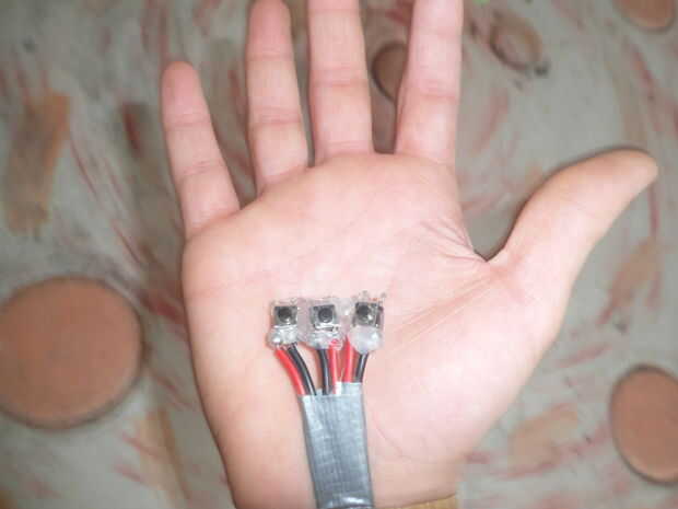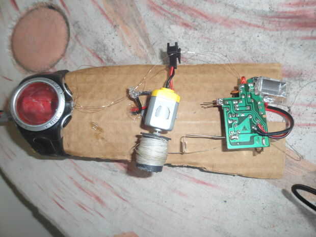 Ahora montar cada cosa en un pedazo de cartón (o lo que es montar en). Ahora necesitamos añadir los interruptores momentáneos. Recuerda los dos cables que hemos soldados al circuito de flash en lugar del interruptor momentáneo que ahora vamos a añadir uno nuevo. Ejecutar los cables que hemos soldados al circuito flash bajo el cartón hasta su mano. Averiguar el lugar más cómodo en su mano para el interruptor momentáneo, corte la tira de alambre extra los cables de una soldadura a un interruptor momentáneo cubren los cables del interruptor con pegamento caliente para que no choque a ti mismo. Ahora toma uno de los extremos del alambre magnético que dejamos sobresale el reloj y a uno de los cables del condensador en el circuito de flash de la soldadura. Soldar el otro extremo del alambre magnético sobresale el reloj a otra longitud de cable de aproximadamente un pie de largo y otro trozo de cable al otro cable del condensador de la soldadura. Ahora ejecutar el el cable del condensador y el cable soldado al alambre magnético bajo el cartón a mano en un punto cómodo en la mano cortar la tira de alambre extra para un interruptor momentáneo de la soldadura y aislarlo con pegamento caliente. Ahora tenemos que añadir un interruptor momentáneo a la devanadera de la web. Recuerde que las longitudes de cable que uno de ellos soldado al motor y uno de al cable positivo de la batería tenemos que hacer lo mismo con ellos, ejecutar en el tablero de tarjeta averiguar una longitud cómoda el corte... tira... soldar a un interruptor momentáneo... y aislarlo. Puede cinta los cables de los interruptores juntos si quieres. Asegúrese de que usted aislar todos los cables con pegamento o con cinta aislante. Ahora tiene que elegir un proyectil. Te sugiero cortar el extremo de un clavo. Ahora introducir el extremo de la seda a través del orificio en la parte posterior del reloj y asegure que el proyectil.
