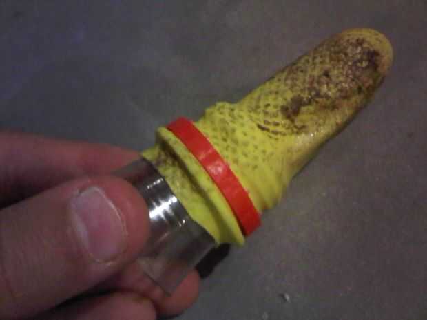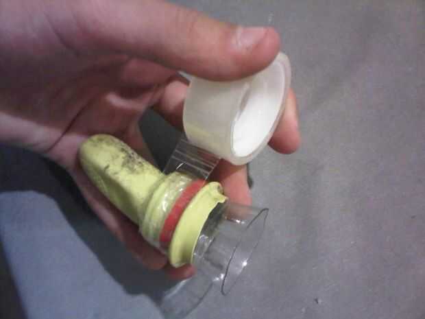 Ahora usted puede deslizar el dedo sobre la parte superior de botella asegurándose de que usted tire de él sobre la pequeña repisa en la parte inferior (esto fortalecerá su) asegurándose de que el dedo no está en un ángulo (si es que destruirá la precisión). Una vez que ha hecho puede ahora Deslice el pequeño anillo de plástico en su lugar y muy bien celo/conducto cinta el dedo en.