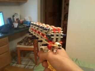 Aquí él es... mi pistola de K'nex de carga superior. Tiene el mismo cuerpo como mi pistola, SAP1 y funciones tan bueno. La 'diapositiva' se ha convertido y ahora se levanta para revelar una superficie donde pones la bala. Dispara una barra, de preferencia amarilla o azul, y se ve bastante cool. Aquí están algunos pros y los de contras