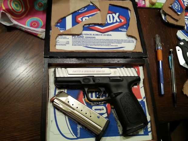 Una vez que todos los de la cartulina se corta, su pistola de la posición y otros elementos como se desee en el cuadro. Trace una línea alrededor de ellos y luego utiliza el cuchillo Xacto y tijeras para recortar la forma de la pistola. Lo la mina, yo corte dos capas en la parte inferior y uno en la parte superior.