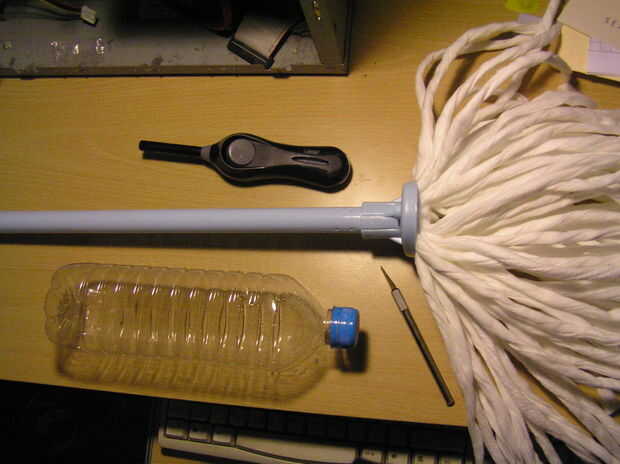 -Un tubo largo de metal. Yo uso el mango de una fregona barato comprado en un supermercado corte roto en mitad de esta compilación, construí una manija de la fregona todo anterior y parte de un toallero para el primero de ellos. El tubo debe ser aproximadamente 2 cm (3/4") de diámetro y tan recto como sea posible. Tubos de wonky hacen cañones pobres.
