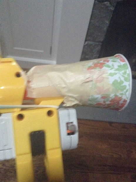 Cortar un agujero en una taza de dixy y grabado en la parte delantera. Booh-Yah.