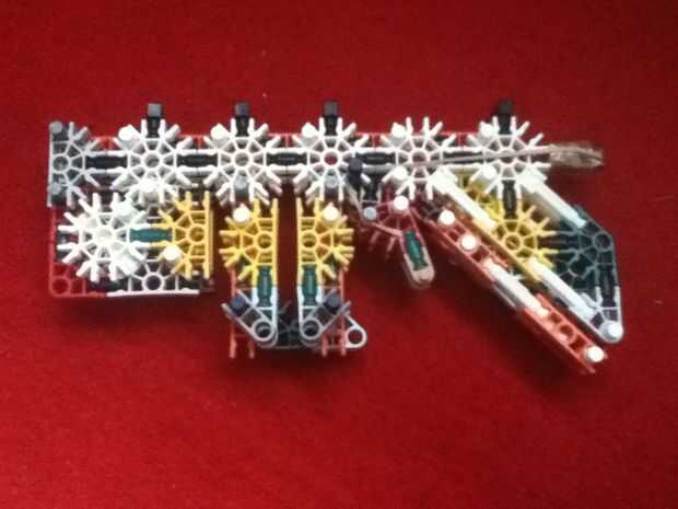 este arma es una pistola de 8 banda de goma tiro semiautomático con un giro, su hecho totalmente de K'NEX!!!!!! Cuando lo piensas bien es un muy simple mechinism, me topé con él mientras estaba tratando de disminuir el índice del fuego de un arma tot