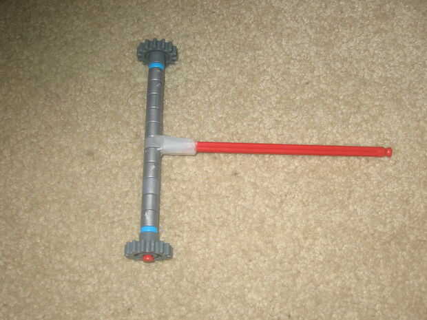 La barra de disparo es bastante simple. Primero Haz una barra roja y coloque un conector de ranura de 1 gris en el extremo de él. Deslice la barra otra rojo a través del agujero en el conector gris. Debe haber 5 separadores de plata y 1 separador azul a cada lado del conector gris. Deslice un engranaje en cada extremo de la barra roja. Asegúrese de cinta juntos. De lo contrario se romperá aparte.