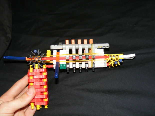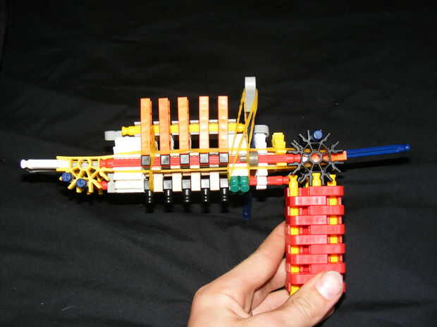 pistola de acción de perno de alta gama. Este arma es muy sencilla de hacer brotes muy lejos. Con un palo afilado, puede ir directamente a través de una pieza si cartón. El diseño es que toda la mina excepto la manija que tomé prestado de la pistola de asalto Auto carga. Tiene un mecanismo de gatillo de bloque muy simple. Tiene una tolva redonda 6 asegurado por bandas de goma que también cerrar el techo para que las barras de azul no se caiga hacia fuera.
