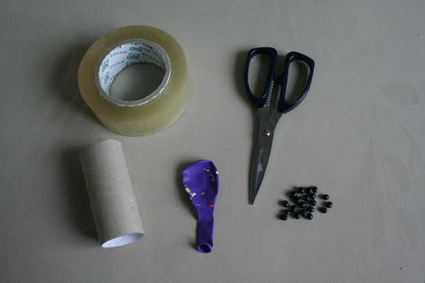 Un rollo vacío de papel higiénico. (o cualquier otro cilindro que tiene a mano), tijeras, cinta, balón y municiones.